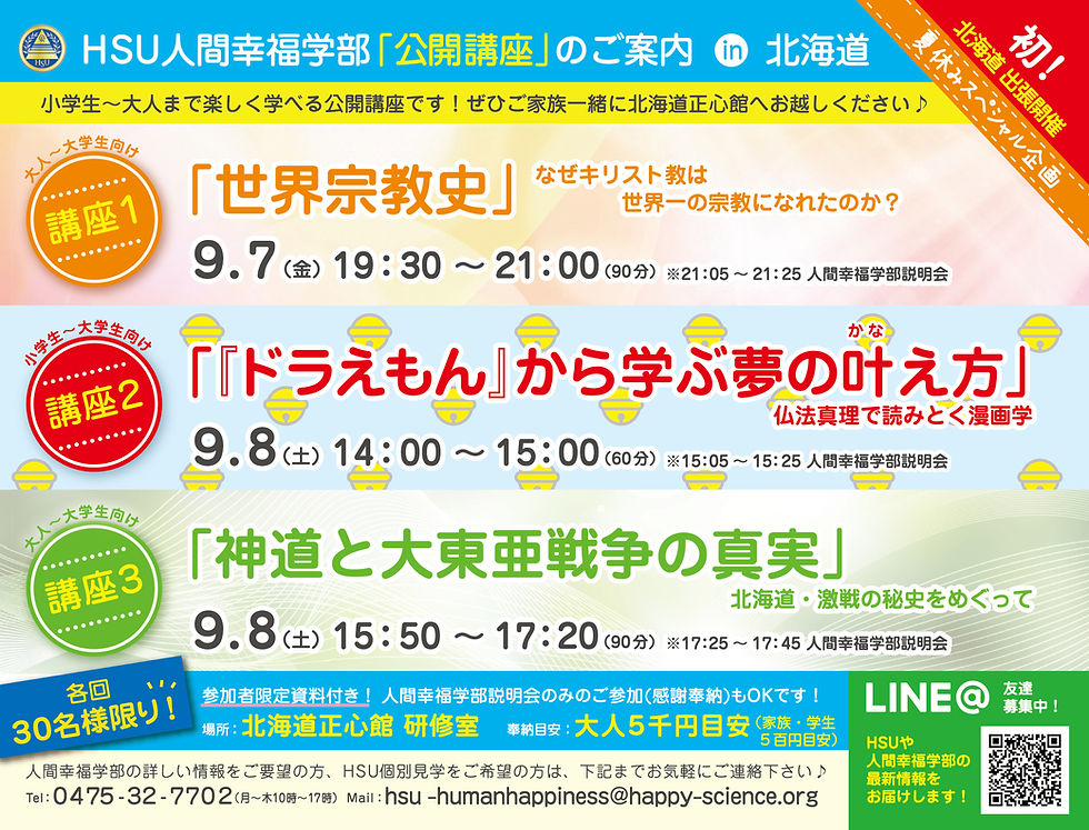 9月7日(金)、8日(土)に、幸福の科学 北海道正心館にて、公開講座を開催いたします。